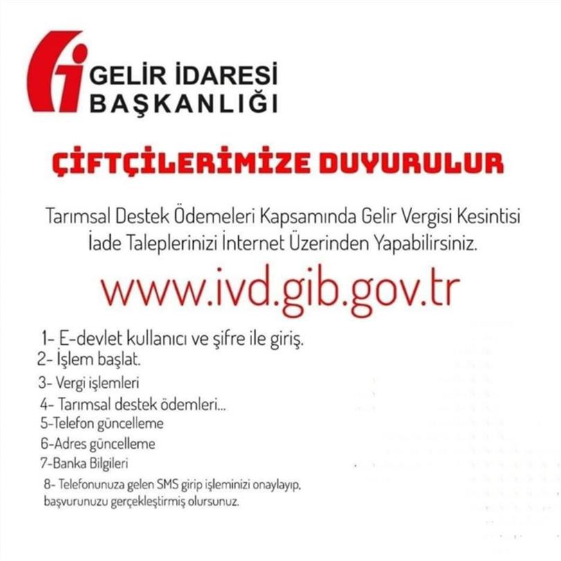 193 sayılı Kanunun geçici 92 nci maddesinin yürürlüğe girdiği 26/10/2021 tarihinden önce Kamu Kurum ve Kuruluşları Tarafından Yapılan Tarımsal Destek Ödemeleri Üzerinden Kesilen Gelir Vergisi Kesintisi İade Taleplerinizi (başvuru sahiplerinin veya vekillerinin düzeltme zamanaşımı süresi içerisinde vergi dairesine bağlı vergi dairesi statüsündeki Mal Müdürlükleri dâhil) İnternet Üzerinden (www.ivd.gib.gov.tr) veya Vergi Dairesi Başkanlıklarına dilekçe (Ek-1) ile yapabilirsiniz.